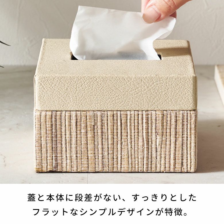 蓋と本体に段差がない、すっきりとしたフラットなシンプルデザインが特徴です。生活感が出がちなボックスティッシュを箱ごと入れるだけで、スタイリッシュでホテルライクな空間に。