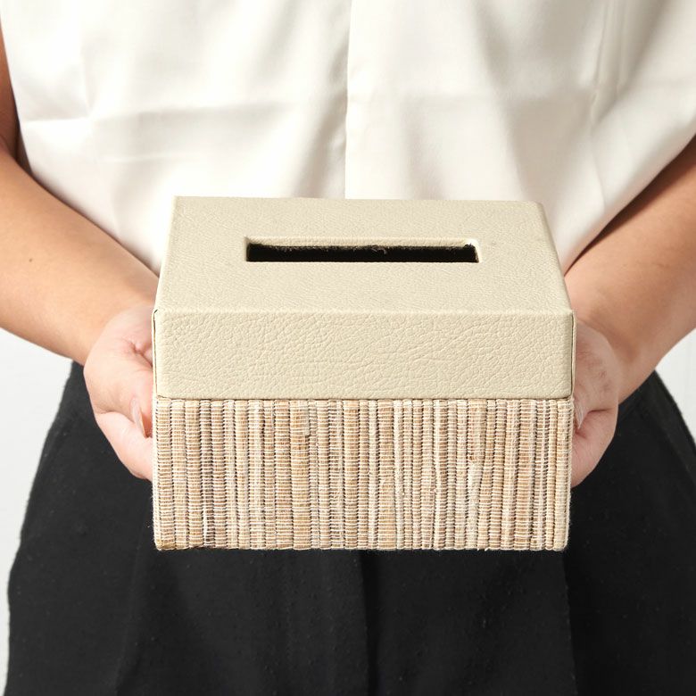 インドネシアの職人によるハンドメイドの温かみと自然素材の美しさが魅力の、ウォーターヒヤシンス素材×フェイクレザーのティッシュケース。