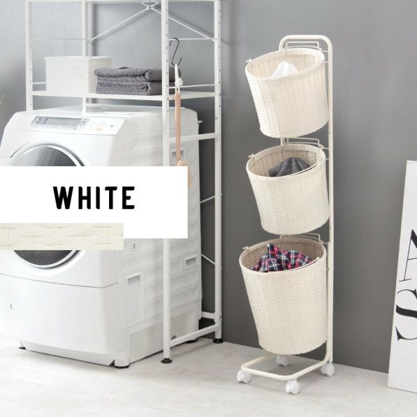ランドリー 洗面所 脱衣所 丸型 大容量 ランドリーバスケット ランドリーラック バスケット かご 付 防水 ラタン調 ラウンド 3段 縦型 ワゴン 約 W 36.5cm D 37cm H 129cm [96059]【 取っ手 取り外し可能 キャスター ラック 洗濯 棚 タテ スリム 収納 省スペース 洗濯物 入れ カゴ ボックス シンプル 北欧 おしゃれ 西海岸 雑貨 】