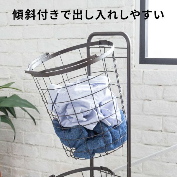 ランドリー 洗面所 脱衣所 丸型 大容量 ワイヤーバスケット ランドリーラック バスケット かご 付 ワイヤー ラウンド 3段 縦型 ワゴン 約 W 35cm D 39cm H 124cm [96047]【 取っ手 取り外し可能 キャスター ラック 洗濯 棚 タテ スリム 収納 省スペース 洗濯物 入れ カゴ ボックス シンプル モダン 北欧 おしゃれ 西海岸 雑貨 】