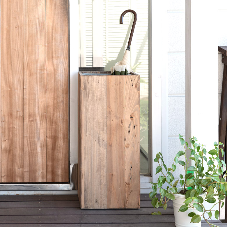 リサイクルのパイン材から作られた、存在感抜群の傘立て。