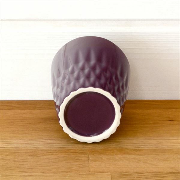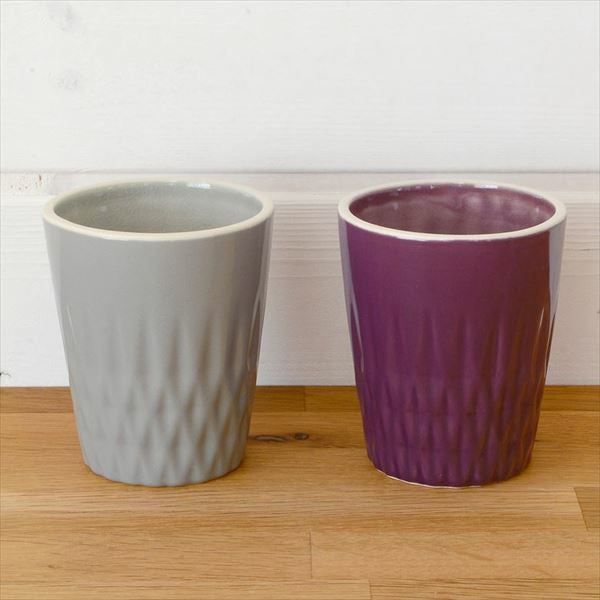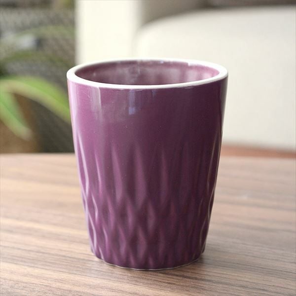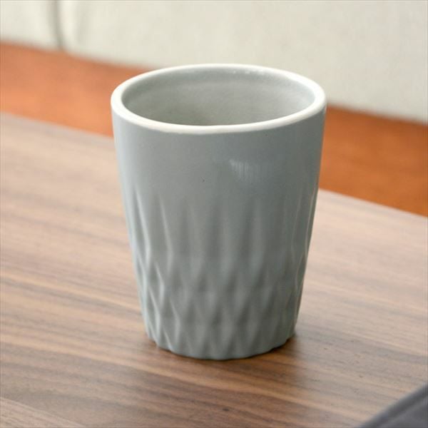 デコボコと凹凸のある模様がデザインされた陶器のタンブラーカップ。
