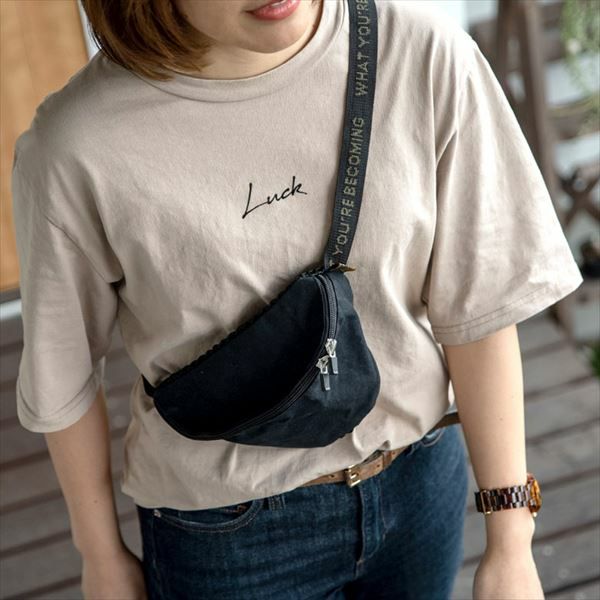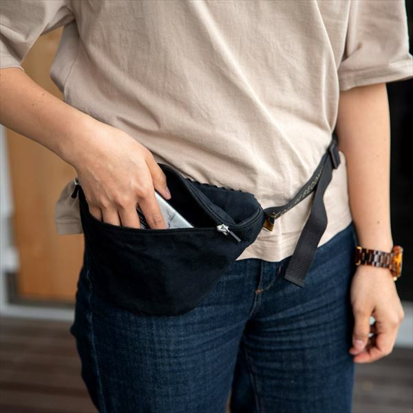 コットンにパラフィンコーティング加工をしたミニウエストポーチ。