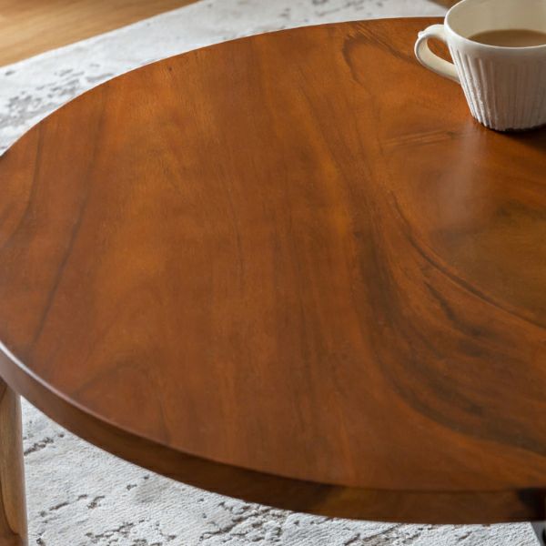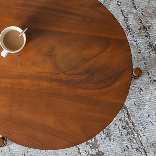 天然木モンキーポッドの美しい木目が魅力的なラウンドテーブル。