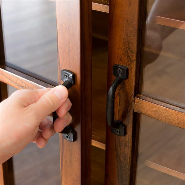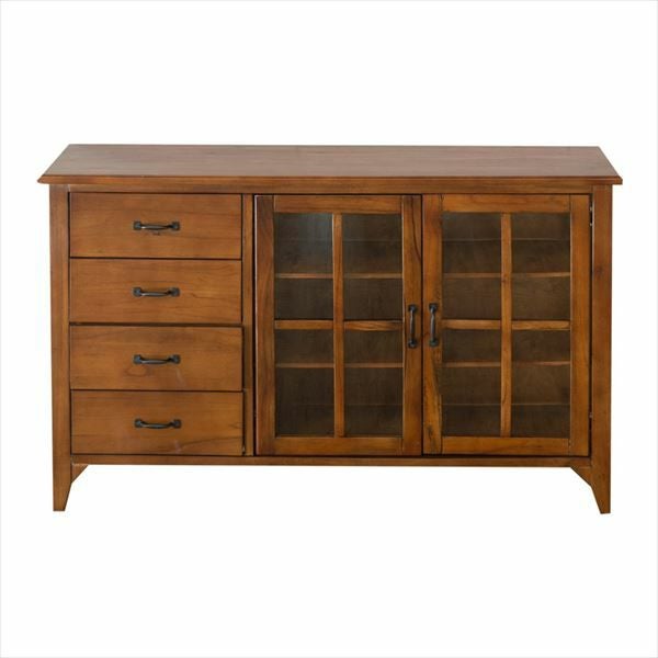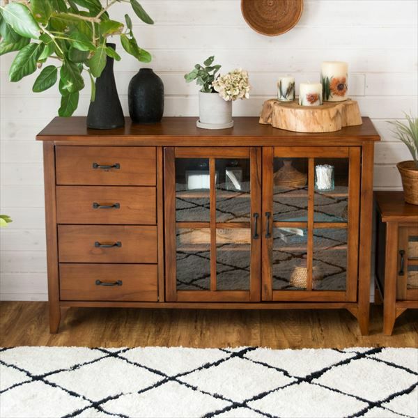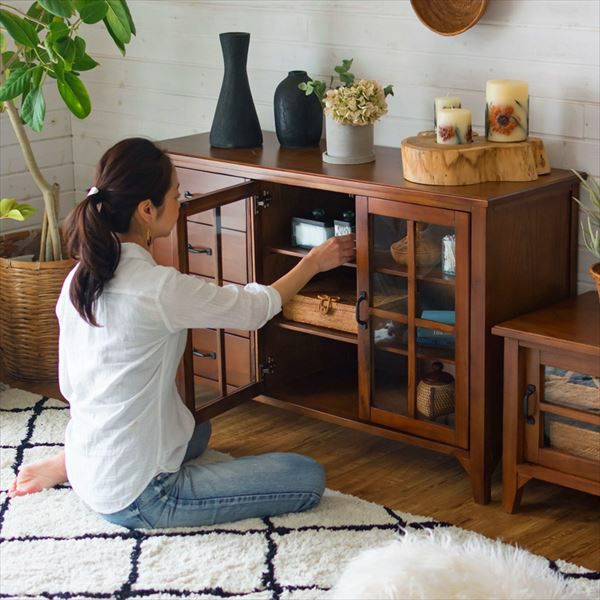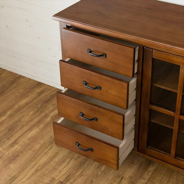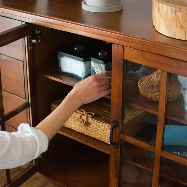 ガラス扉と引き出しがついた、収納力たっぷりのリビングチェスト。