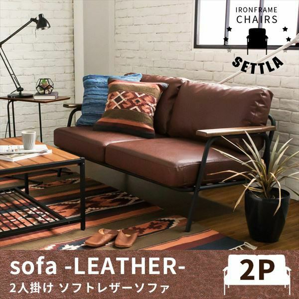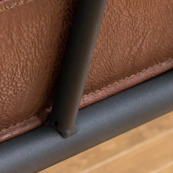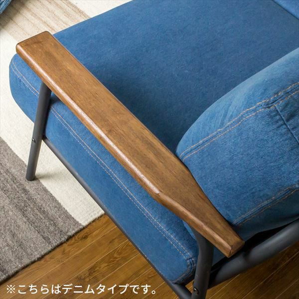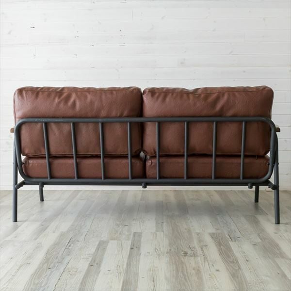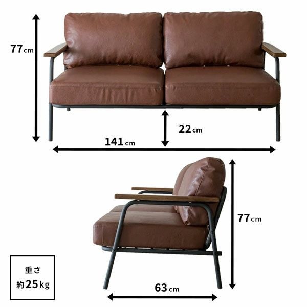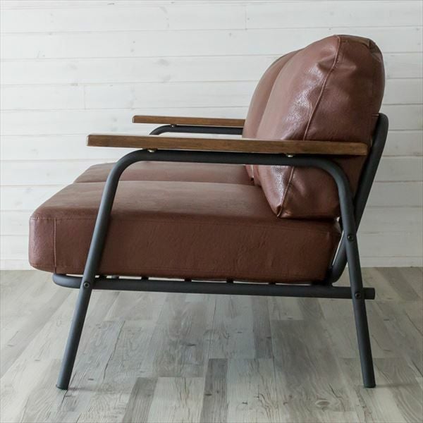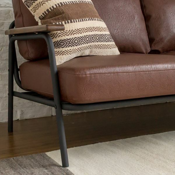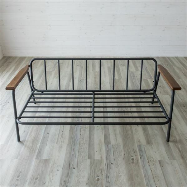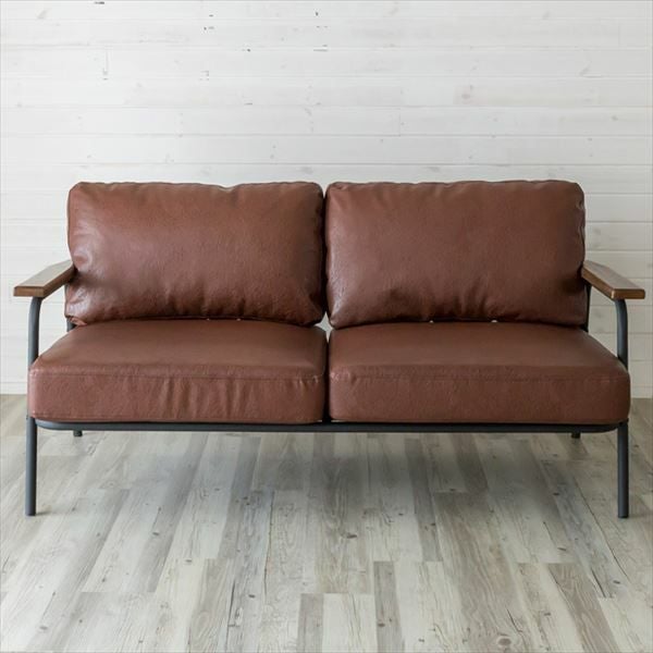 シンプルなスチール製のフレームと、天然木のアームを組み合わせたコンパクトな2人掛けソファ。