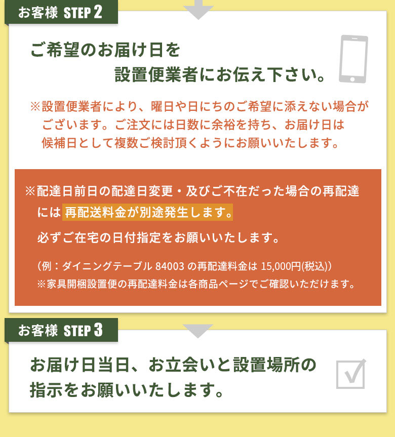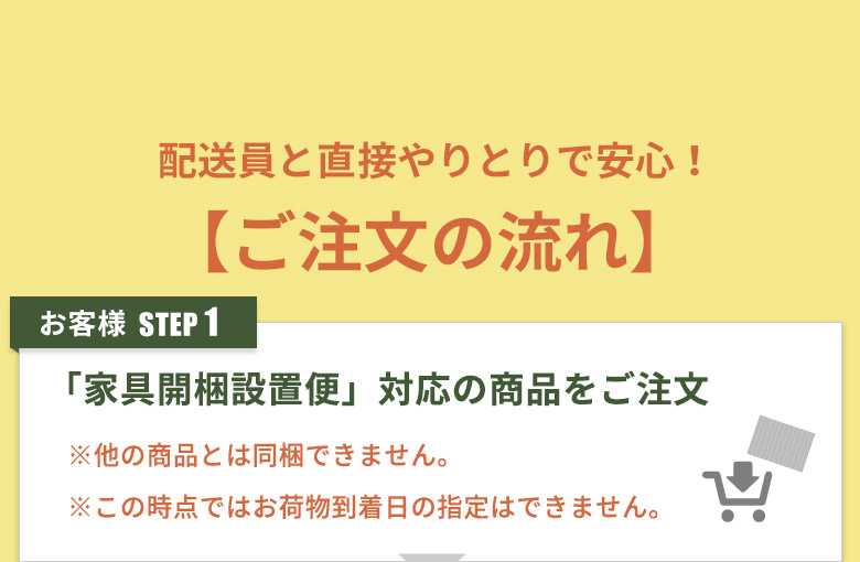 搬入は玄関口からのみ行います。玄関口からの搬入が出来ない場合は、玄関先や建物前でのお渡しとなります。その場合、配送料金の返金はいたしかねます。また、そのことを理由としての商品の返品は承りかねます。 <!>家具の移動はこちらでは出来ません。 お部屋に元々ある家具の移動は事前に行って頂き、開梱や家具設置作業がすぐに開始できるよう必ず準備を済ませておいてください。 <!>階段上げは2階まで無料で対応! 階段上げは2階まで無料で対応させていただいております。 <!>配送員は2名でお伺いします。 <!>お届け日当日、必ずお立会いと設置場所の指示をお願いいたします。 <!>家具の引き取り不可 もともとお部屋にあった家具の引き取りは行っておりません。 【02】お届けについて <!>地域によってお届けできない場合がございます。 その場合は担当者より再度ご連絡させて頂きます。 <!>お届け日時指定について 注文時はお届け日の指定ができません。 <!>着払い不可 着払い以外の当店対応中の決済方法をお選び頂けますよう、よろしくお願いいたします。 【03】返品・キャンセルについて <!>商品詳細確認不十分による返品・返金は不可 商品サイズの確認不十分などの理由による返品・返金は原則としてお受けできません。 <!>搬入不可による返品 お部屋に搬入できず返品される場合、往復の配送料と商品代金の10%をお客様にご負担頂きます。 <!>梱包開封後の返品不可 商品梱包が開封されていた場合は返品できません。あらかじめご了承ください。 【04】配達時ご不在だった場合 <!>不在時の再配達について お届けの際お客様がご不在だった場合、商品の保管および再配達の期限は、当店の発送日から2週間以内とさせて頂きます。 お約束の時間にご不在で配達員が荷物を持ち帰ることになりますと、配送会社により再配達料として追加料金が発生いたします。(※詳しくは次の事項『配達日前日の配達日変更・及び不在時の再配達に伴う料金発生について』をご参照ください。) また、再配達のお手配には数日間のお日にちを頂きます。ご了承ください。 【05】配達日前日の配達日変更・ <!>以下の場合は再配達となり、再配達料金が発生します。