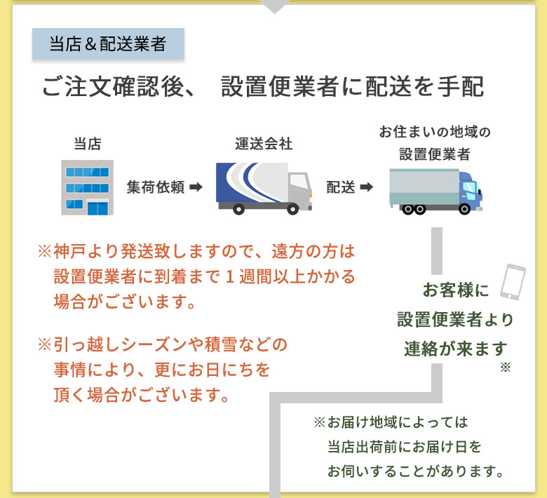 【01】搬入について <!>搬入経路(エレベーターを含む)を事前にご確認ください。 搬入経路が狭く、設置されるお部屋へ商品を搬入することができない場合は搬入可能な場所までのお届け・設置となります。 あらかじめ搬入経路の幅・高さ・戸口サイズなど充分にご確認頂き、当サービスをご利用ください。(エレベーターを含む)また、配達の際に搬入経路と搬入先を配送員が確認いたしますが、その際に搬入が困難だと判断する場合がございます。 <!>搬入は玄関口からのみ。窓からの吊り上げ対応不可