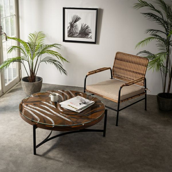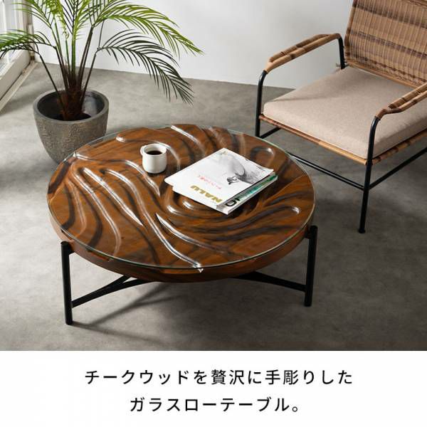 ラウンドテーブル ガラステーブル ガラス天板 ガラストップ 手彫り 彫刻 什器 オブジェ リビング ダイニング 店舗 カフェ ホテル レストラン モダン カフェテーブル 食卓 食卓テーブル テーブル ローテーブル チーク ウッド 天然木 木製 ガラス 約 W 90cm D 90cm H 36cm ブラウン ナチュラル ラウンド 円形 直径 90cm センターテーブル リビングテーブル ダイニングテーブル 高級感 完成品 おしゃれ 北欧 リゾート 家具 インテリア 西海岸 [91621]