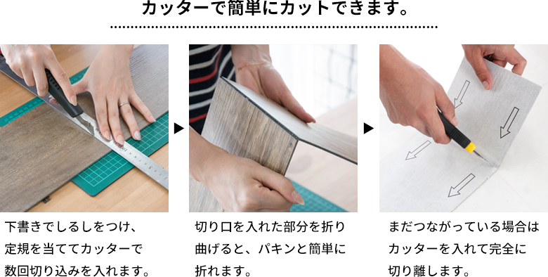 カッターでかんたんにカット お部屋の形に合わせて、カッター1本で女性でも簡単に施工できます。 |