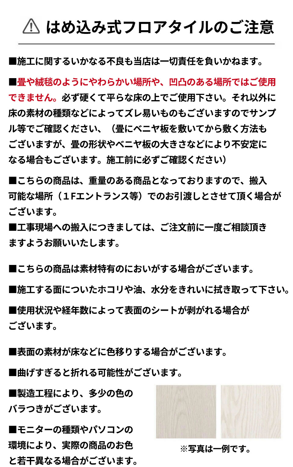 商品が反応し床への移染や変色、変形する恐れがあります。