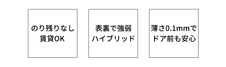 のり残りのしにくい仕様の両面テープなので、引っ越しの際にも跡を残さず原状回復ができます。日本製の丈夫な基材の為、テープがちぎれることなくキレイに剥がせるので、賃貸だけでなく、撮影ブースや展示スペースなどの一時的な施工にも安心してお使いいただけます。