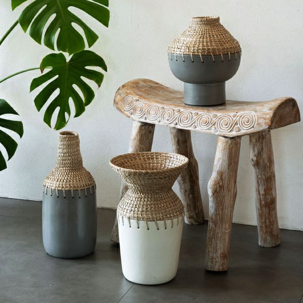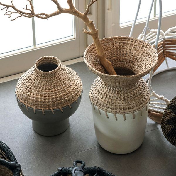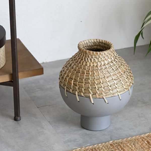 花瓶 花器 花入れ 造花 フラワーポット リゾートインテリア フラワーベース テラコッタ製 ※水入れ不可 シーグラス編み込みデザインB グレー×ナチュラル 高さ約27cm [13722]【 花瓶 花びん 花器 丸形 ドライフラワー アートプランツ フェイクグリーン オブジェ デコレーション 置物 おしゃれ モダン BOHO 】