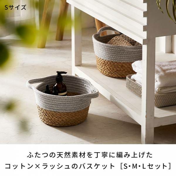ロープバスケット 自立 ラウンド 重ねて収納 スタッキング ハンドル コットンロープ カラーボックス対応 カウンター収納 リビング ダイニング キッチン 玄関 子供部屋 プレゼント バスケット 3個セット コットンロープ ラッシュ製 持ち手付き バイカラー S.M.L かごバスケット 収納 かご 籠 丸 円形 丸型 プランターカバー 鉢カバー サイズ違い 5号鉢 6号鉢 7号鉢対応 インテリア おしゃれ 北欧 西海岸 韓国 [set-67119-67121]