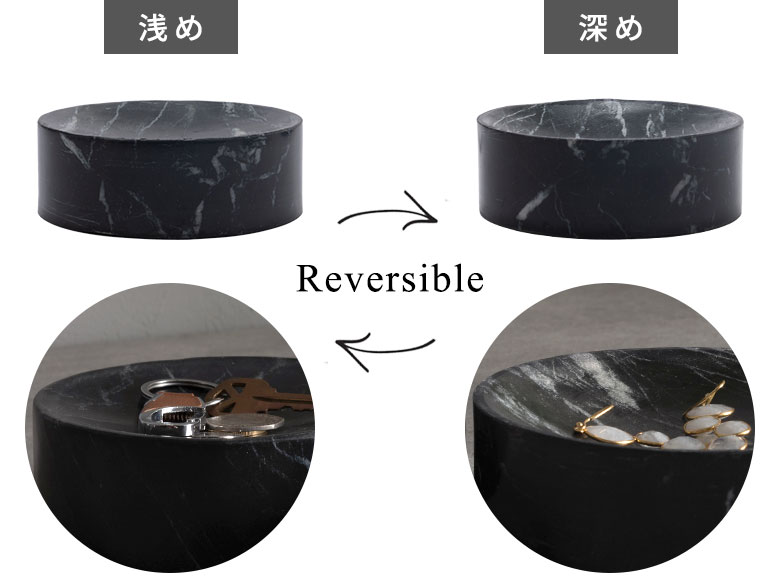 重厚な天然大理石を贅沢に削り出したラウンドトレイは、絶妙なカーブを緻密に計算して設計。美しいデザインでありながら、小物がスムーズに手に取れる心地よい使い勝手も兼ね備えています。さらに、裏と表でカーブの深さが異なる2wayリバーシブル仕様で、置く物に合わせて面を使い分けることができ、アクセサリーのディスプレイから細かな小物収納まで幅広い用途に活躍します。