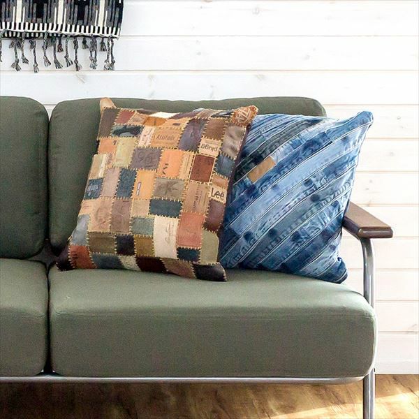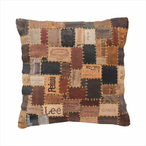 ジーンズのパッチをつなぎあわせて作った個性的な革製クッション 【 ヌードクッション付き 】パッチワーク レザー クッション 45角 45×45cm (91119)【 クッションカバー ヌードクッション付き 革 本革 パッチ タグ インド ヴィンテージ ダメージ レトロ 西海岸 アメリカン 男前 おしゃれ インテリア 】