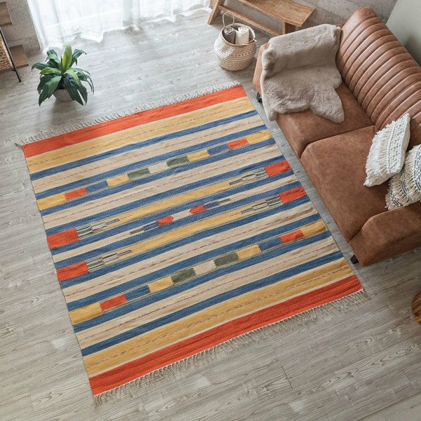 サイドのフリンジや、目を惹く色味がお部屋のアクセントになるキリムラグ。