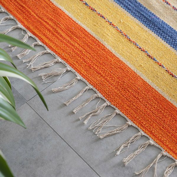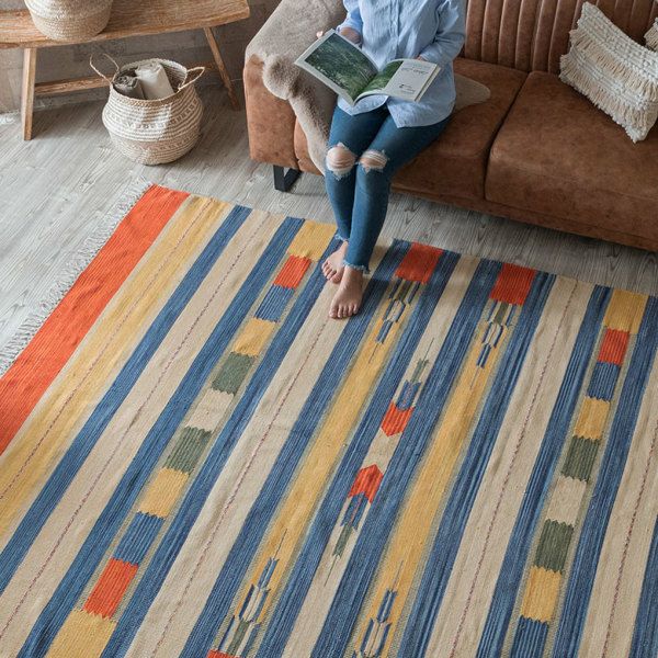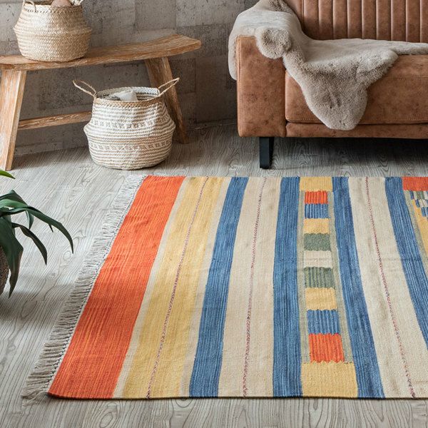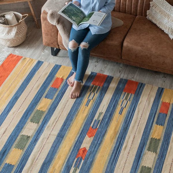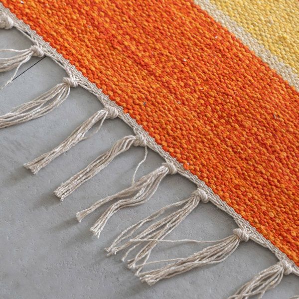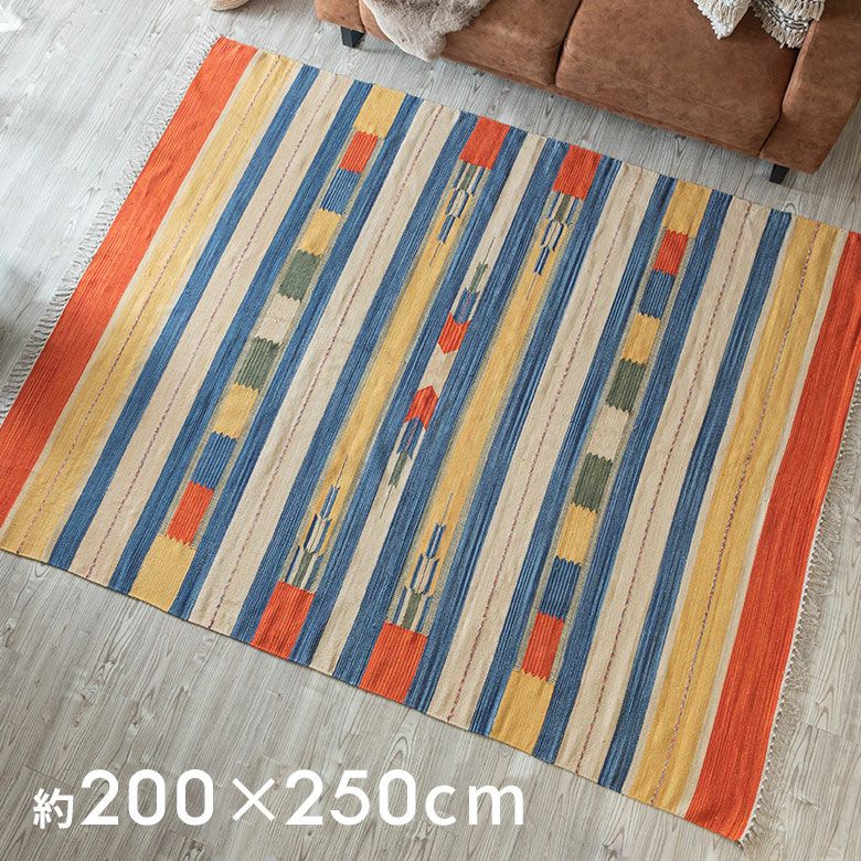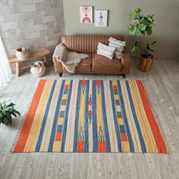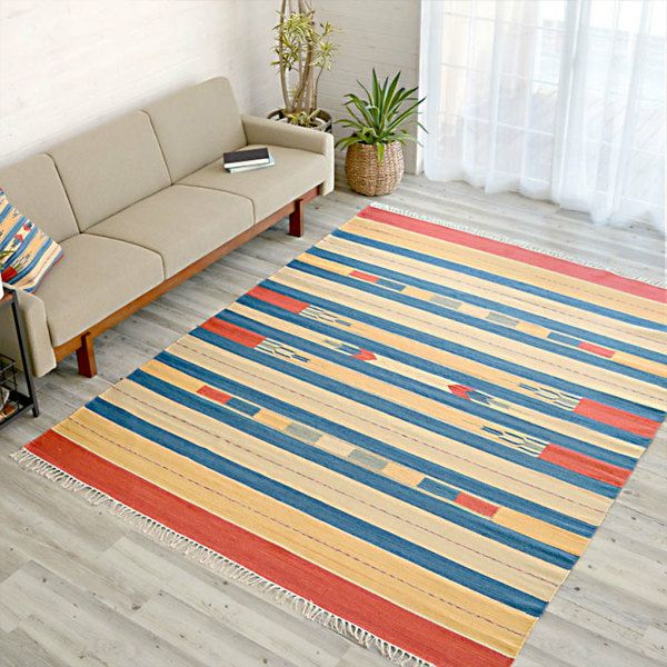 サイドのフリンジや、目を惹く色味がお部屋のアクセントになるキリムラグ。