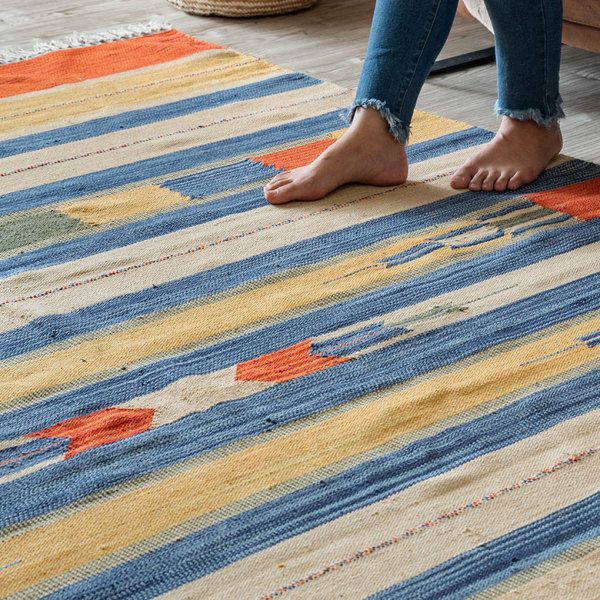 サイドのフリンジや、目を惹く色味がお部屋のアクセントになるキリムラグ。