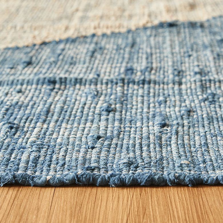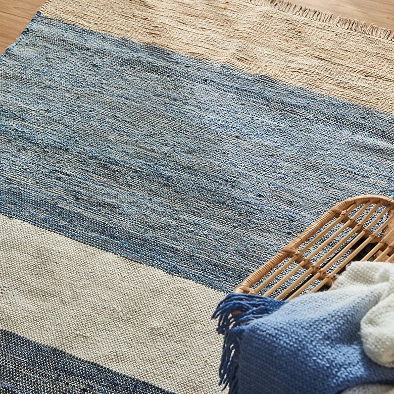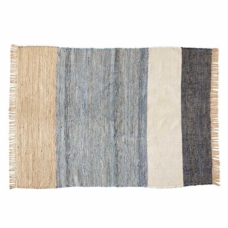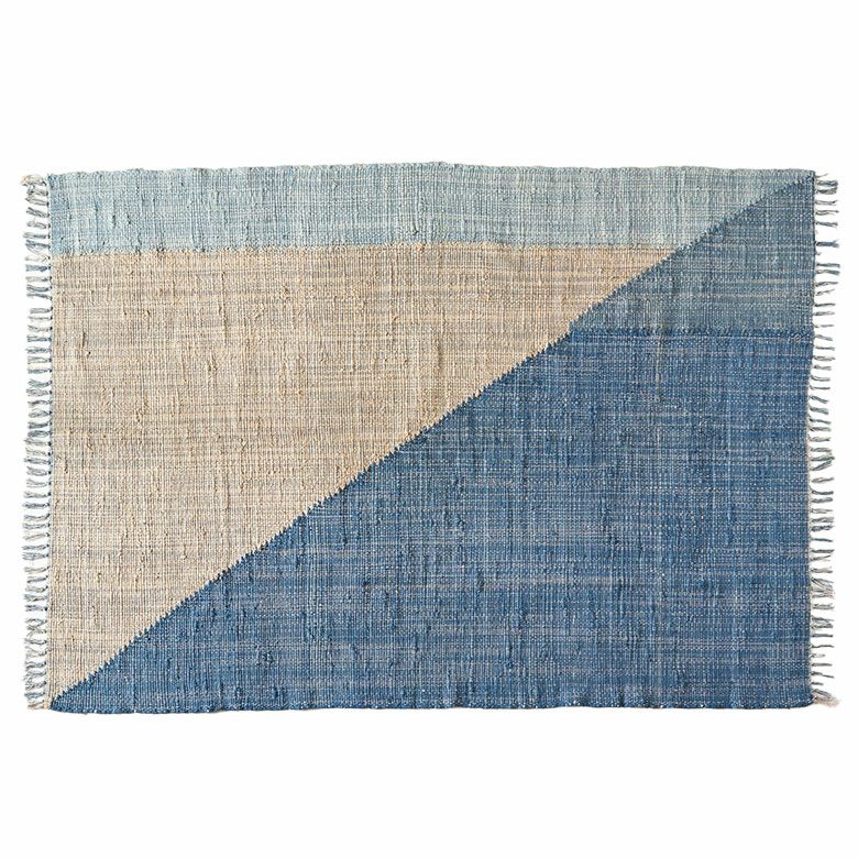 キリムラグ ラグマット インド綿 青 エスニックラグ ネイティブ 玄関マット 室内 コットン ラグマット ワイドストライプ柄 フリンジ付き 綿100% 60×90cm ブルー[34401-bl]【 コットンキリム おしゃれ 綿 玄関 ラグ カーペット かわいい 敷物 キリム風ラグ 長方形 ボーダー柄 夏用 オールシーズン 西海岸 インテリア 】