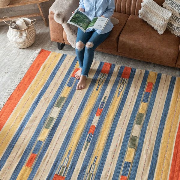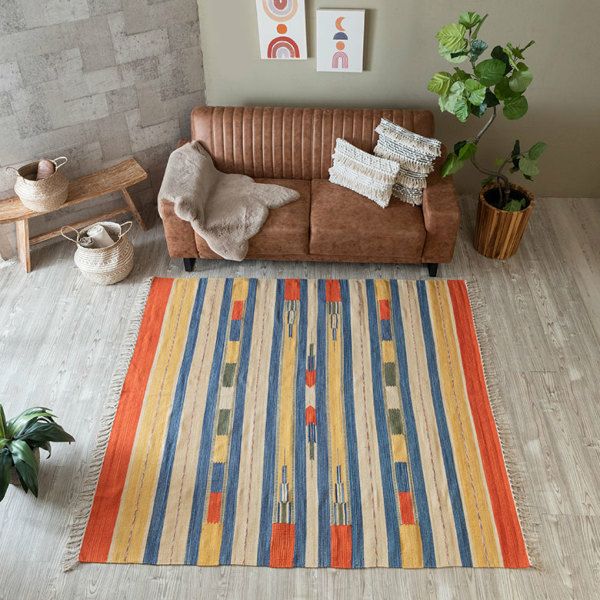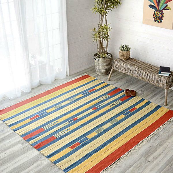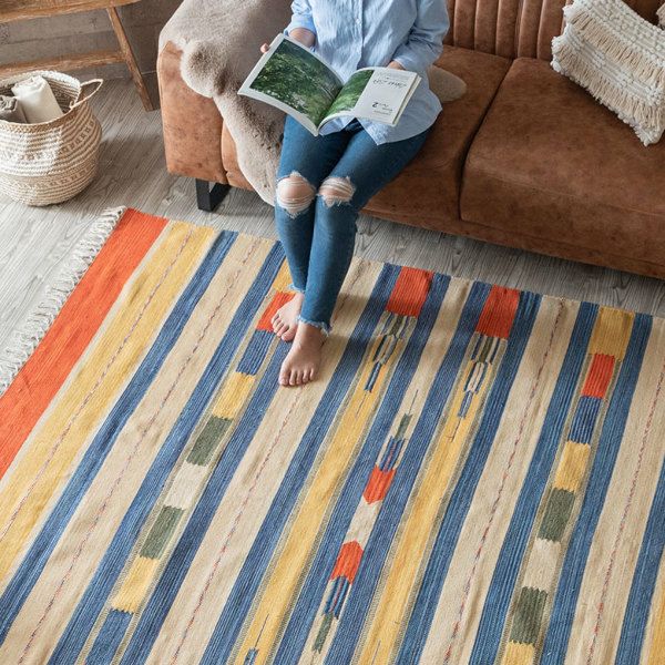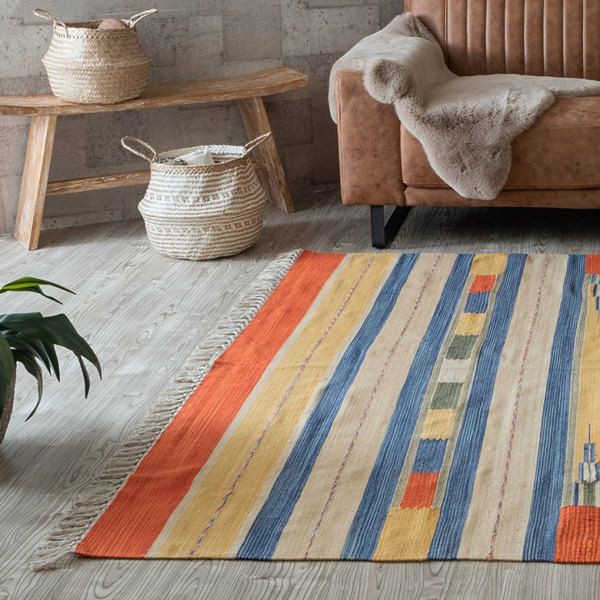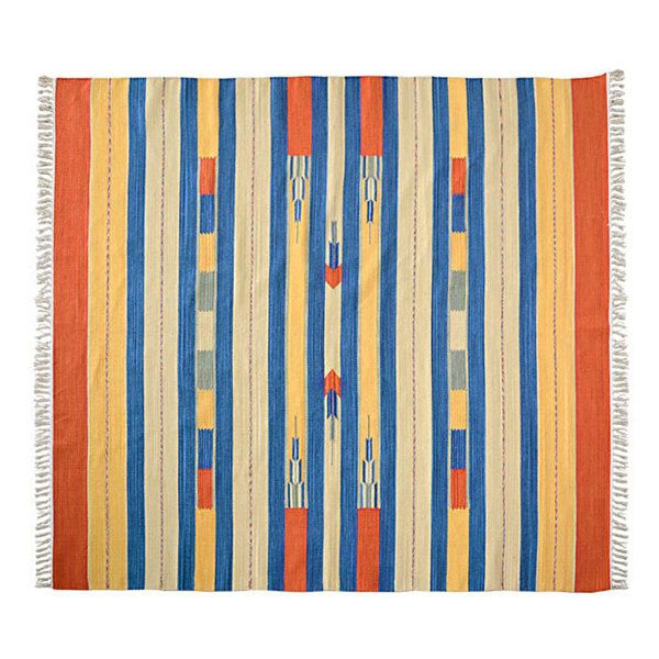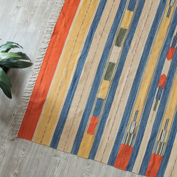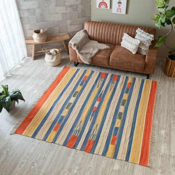 サイドのフリンジや、目を惹く色味がお部屋のアクセントになるキリムラグ。