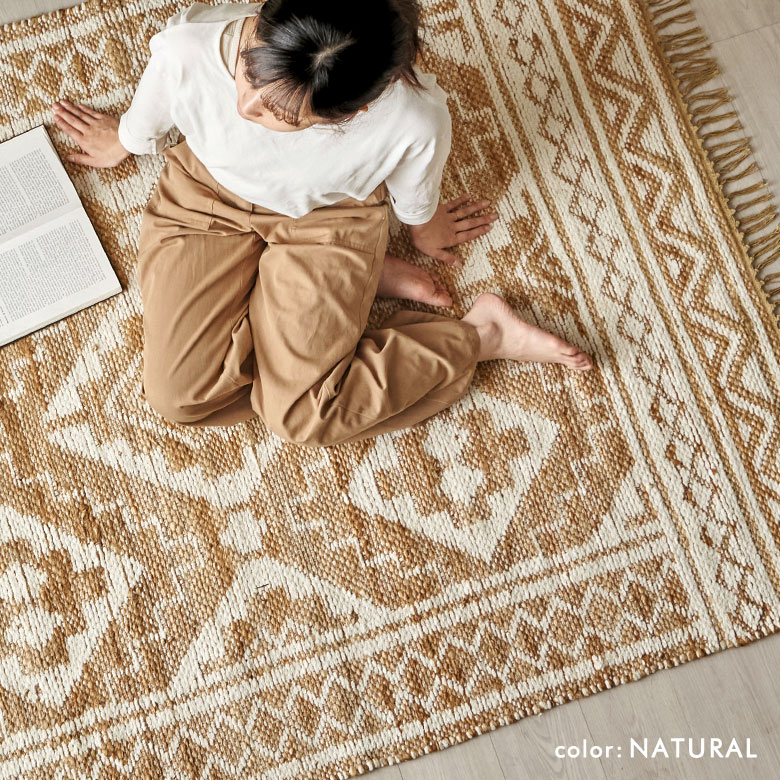 手織り リビング インド BOHO ボーホー 絨毯 敷物 マット ラグ ラグマット 約 130×190 cm 長方形 ジュート 麻 ウール 羊毛 ナチュラル [34446-nt]【 デザイン カーペット 天然素材 ハンドメイド おしゃれ 北欧 オールシーズン 春 夏 秋 冬 リゾート ヴィンテージ風 幾何学模様 アジアン エスニック 男前 西海岸風 】