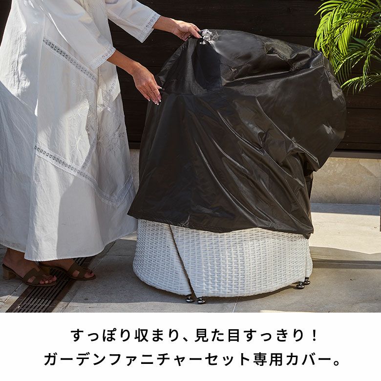 ・すっぽり収まり、見た目すっきり!ガーデンファニチャーセット専用カバー。かぶせて、裾を絞るだけの簡単取り付け。
