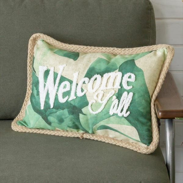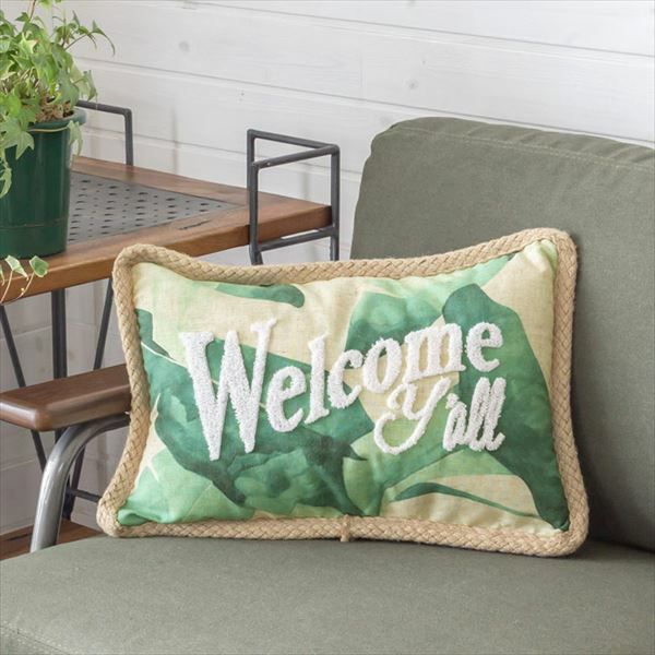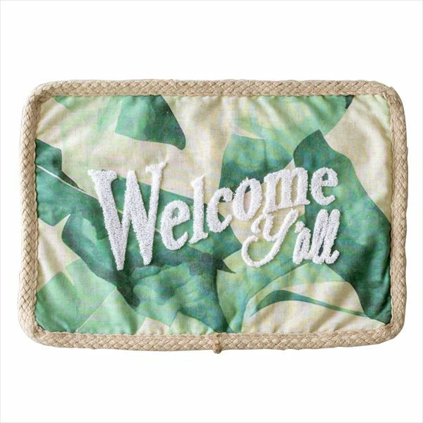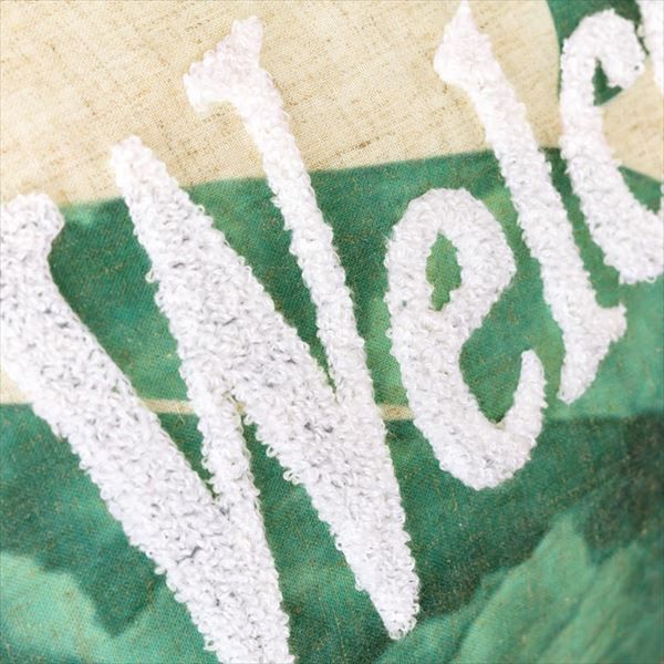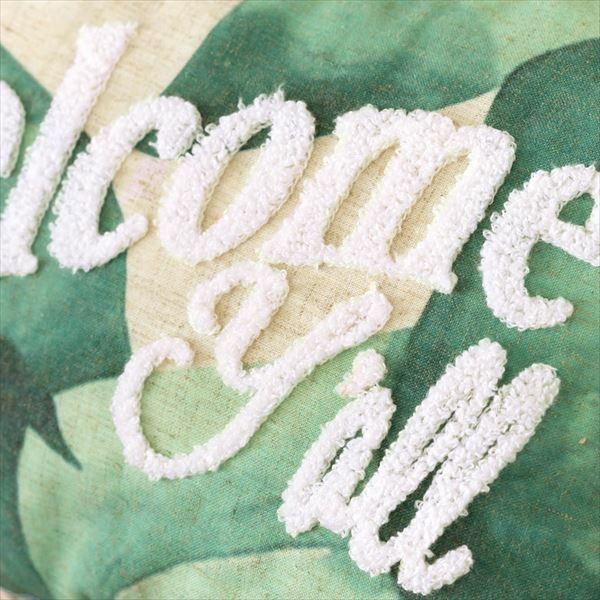 リアルに表現されたバナナリーフがプリントされた生地に、ビンテージライクなデザインフォントのメッセージのパイル刺繍入り。