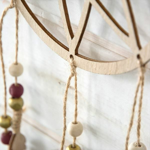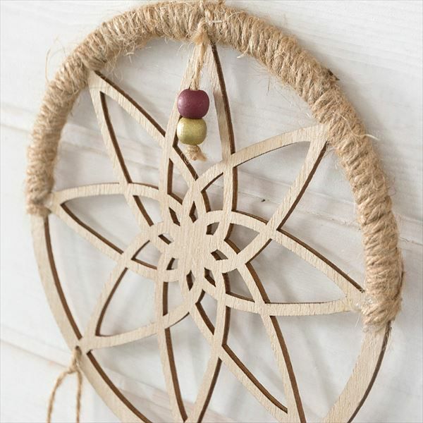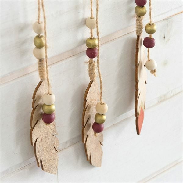 こちらは、円形レリーフから、ウッドビーズとフェザーが吊り下げられたデザイン。
