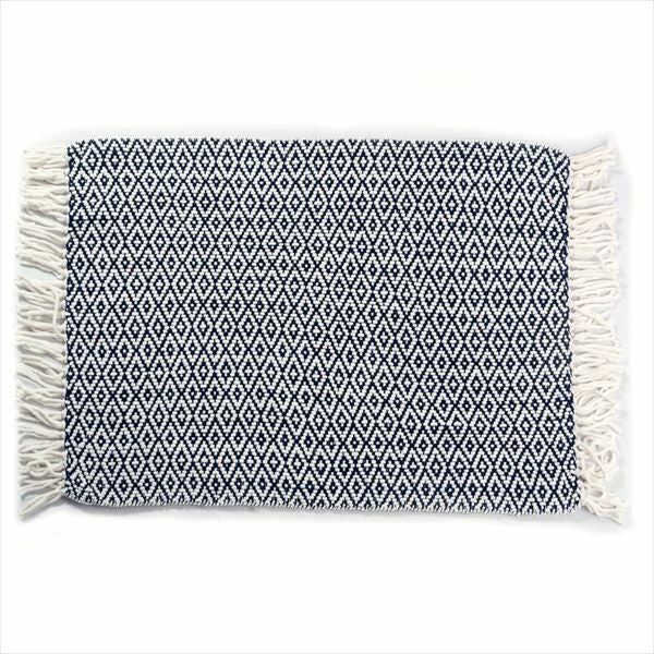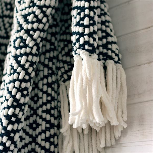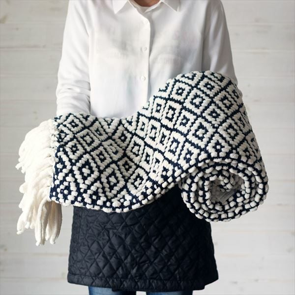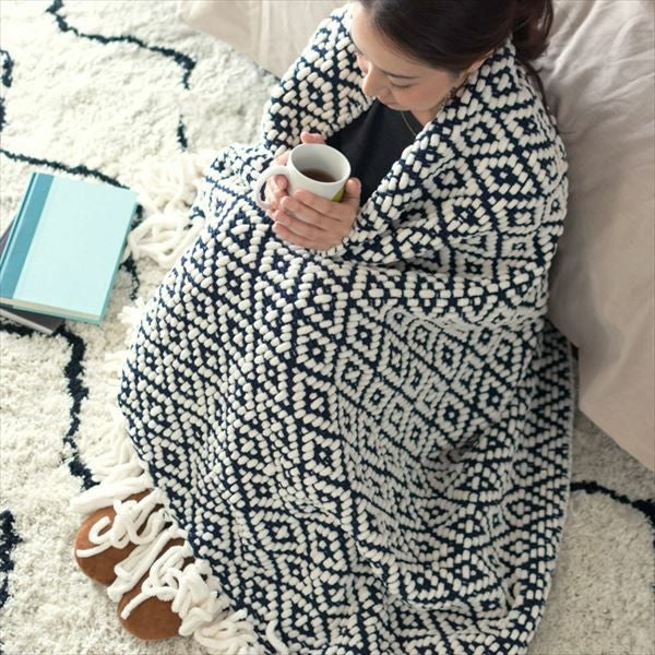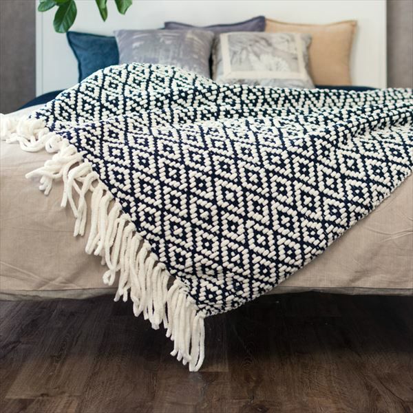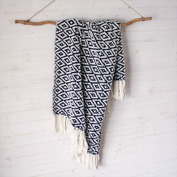 大胆で印象的な、ネイビーのダイヤ柄ブランケット。