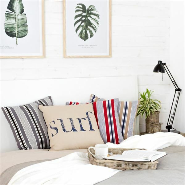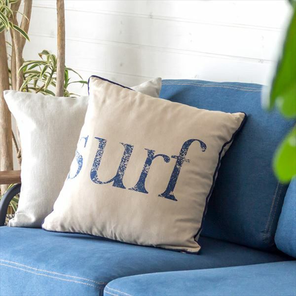 まさに西海岸テイストにピッタリな、"surf (サーフ)"のロゴ入りクッションカバー。
