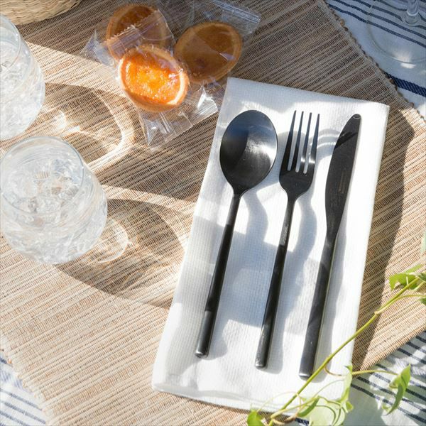 珍しいオールブラックのカトラリーは、平たいハンドルもスマートでクールな印象。