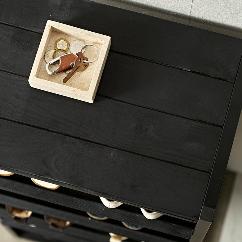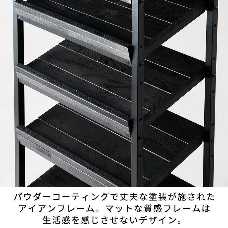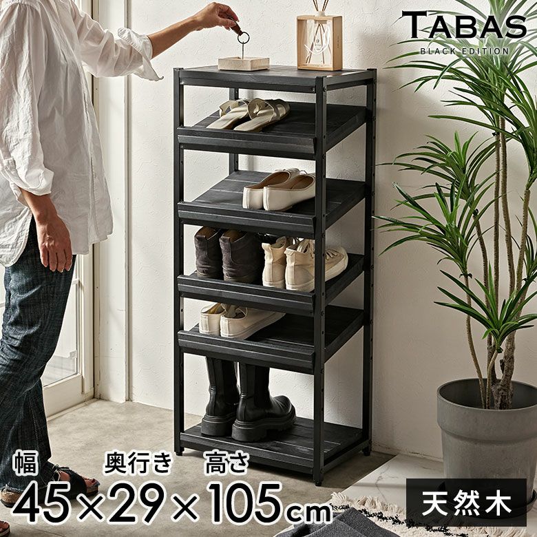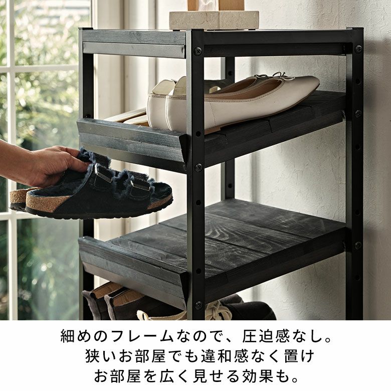 木目の美しいパイン無垢材とブラックアイアンという、異素材を組み合わせた家具シリーズ「TABAS BLACK EDITION」のシューズラック。洗練されたシンプルで無駄のないデザインは飽きがこず、使うほどに味わいが増していきます。