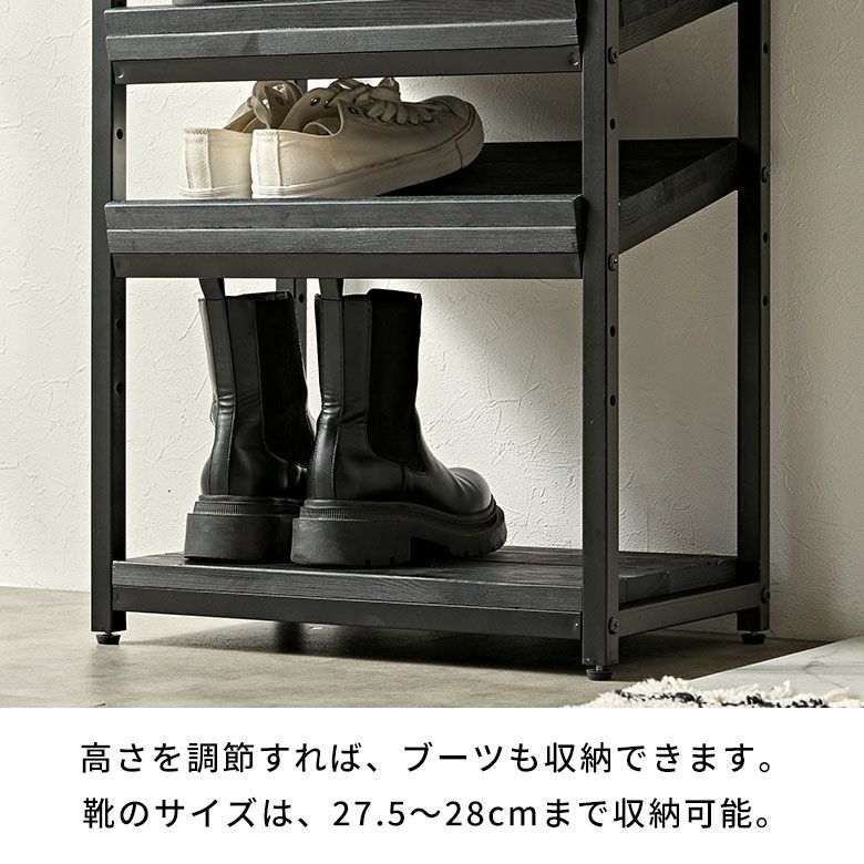 ・高さが変えられる棚板4枚が付属しており、置き方次第で最大12足まで収納可能