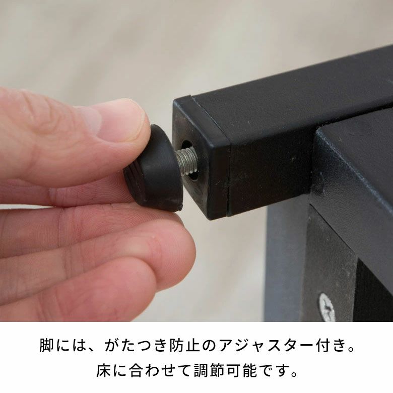 アイアンフレームはパウダーコーティングで丈夫な塗装。経年変化で錆が出ることもありますが、それもまた風合いとして楽しめます。モダンなダークカラーが魅力のチャコールブラックの天板は、木目が美しく際立つようオイルステインで3度塗り重ねたこだわりの仕上がりです。