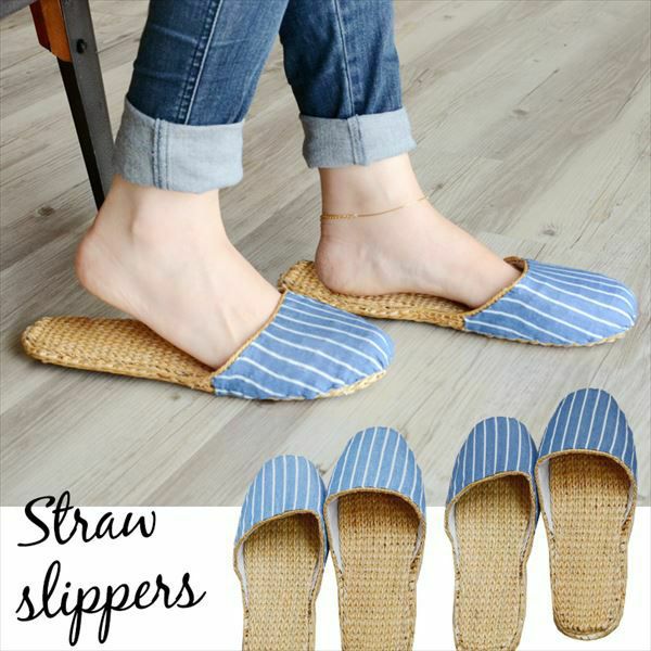 夏の素足に心地よいムギワラ製!ブルーのストライプ柄スリッパ。 ムギワラスリッパ レグネットストライプ(92049)【生活雑貨のELEMENTS本店】