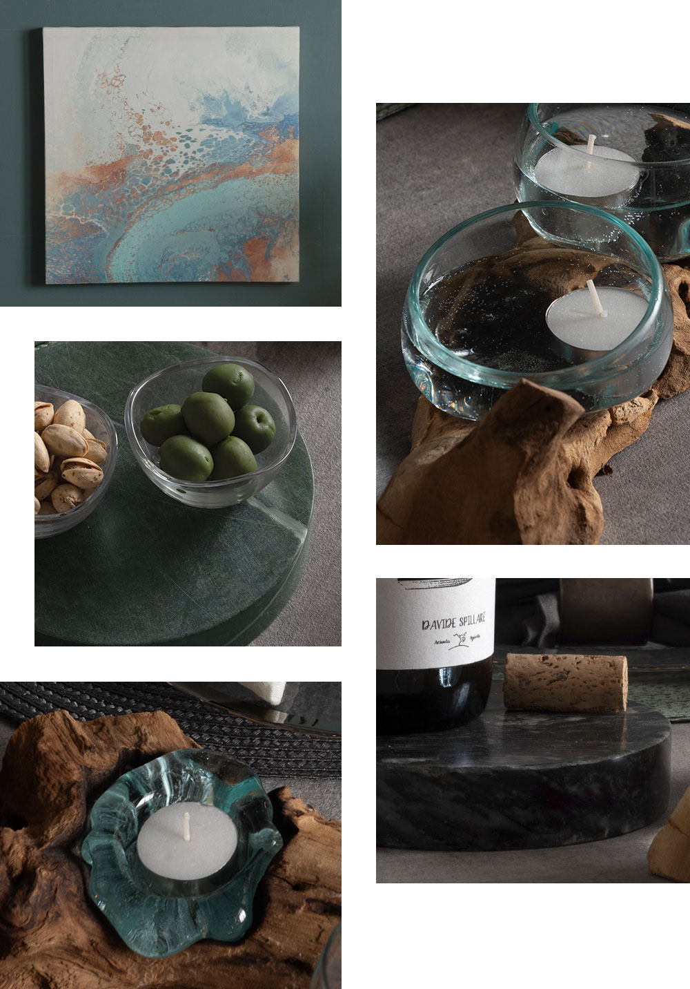 古木にガラスを流し込んで作られたリサイクルガラスのフローティングキャンドルホルダーを取り入れ、