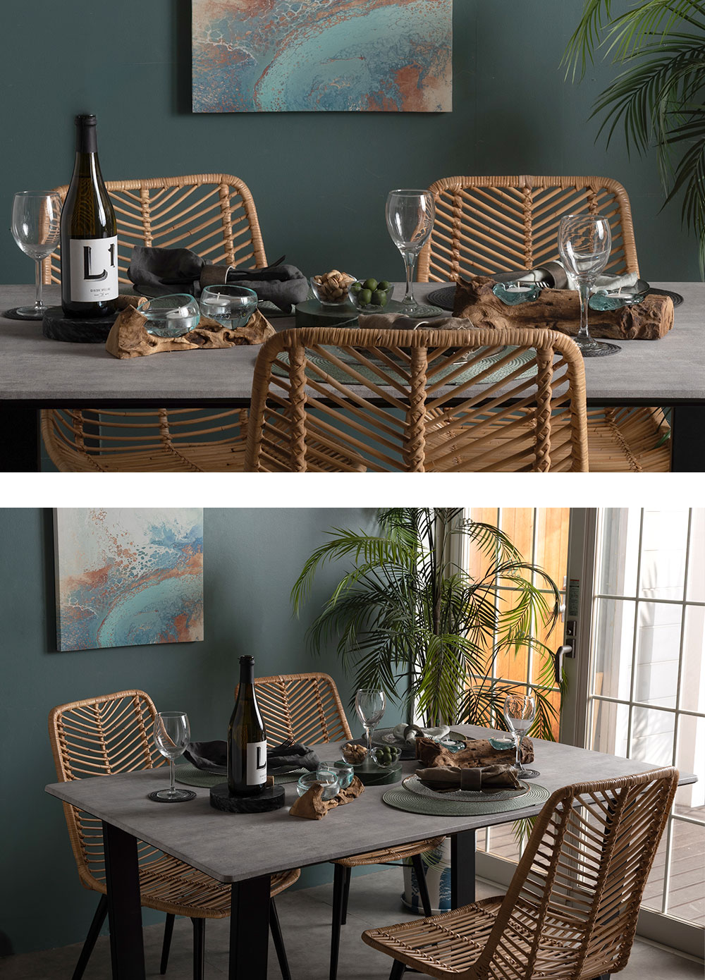 合わせたのは、艶やかなラタン(籐)を贅沢に用いたシェブロンデザインのチェア。