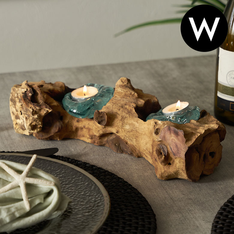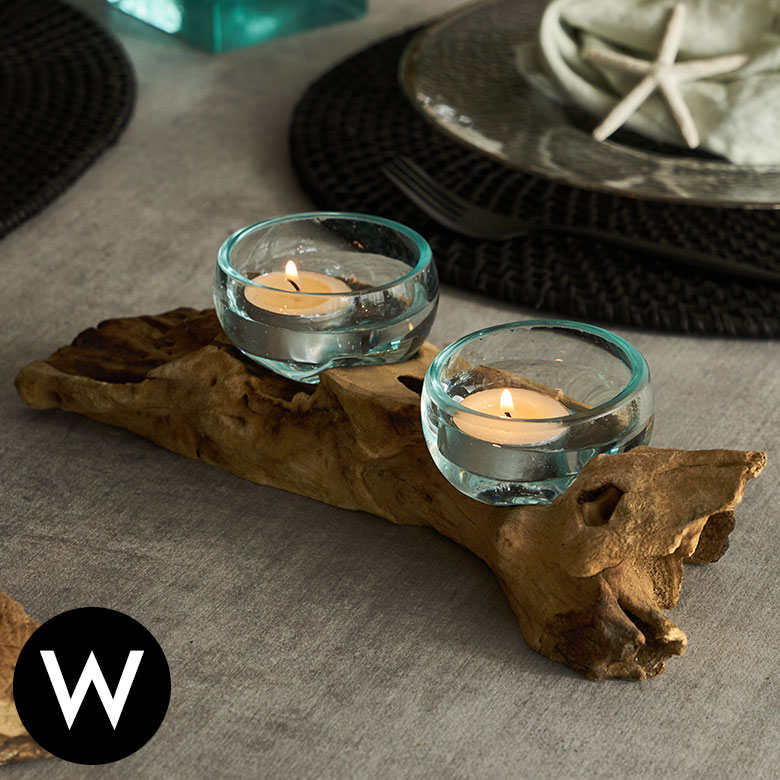 古木の自然な造形と職人の技が織りなす、古木×リサイクルガラスのフローティングキャンドルホルダー。