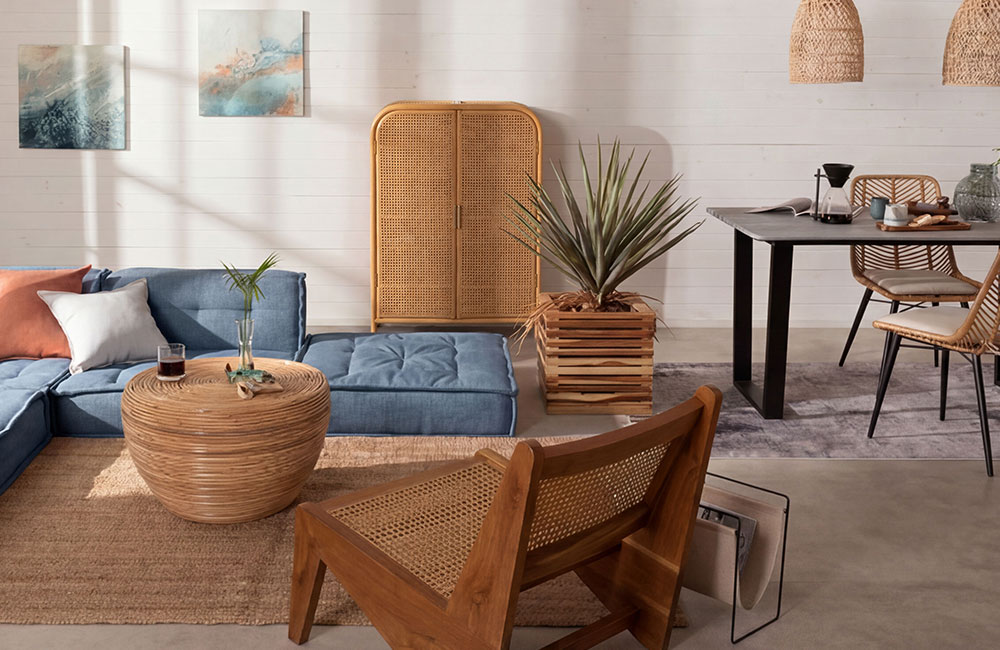 ラタンや古材など天然素材をミックスしてカジュアルに