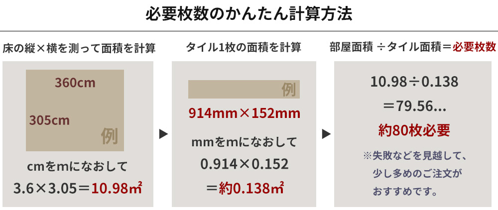 タイルの1枚あたりのサイズを商品ページよりご確認の上、ご計測頂いた設置スペースよりご算出ください。